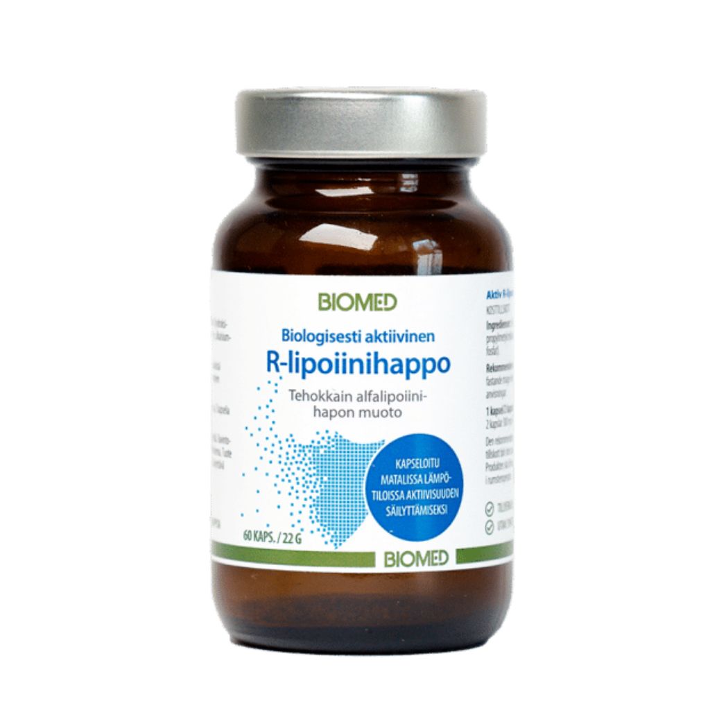 Aktiivinen R-lipoiinihappo R-alfalipoiinihappo, joka on kapseloitu matalissa lämpötiloissa. Alfalipoiinin eri muodot Alfalipoiinihaposta on kaksi muotoa: Luonnollinen R-lipoiinihappo (R-ALA) ja synteettinen S-lipoiinihappo (S-ALA). Markkinoiden uutuus on Biomedin R-Lipoiinihappo-valmiste, joka sisältää ainoastaan alfalipoiinin R-muotoa. Valmistettu Suomessa.