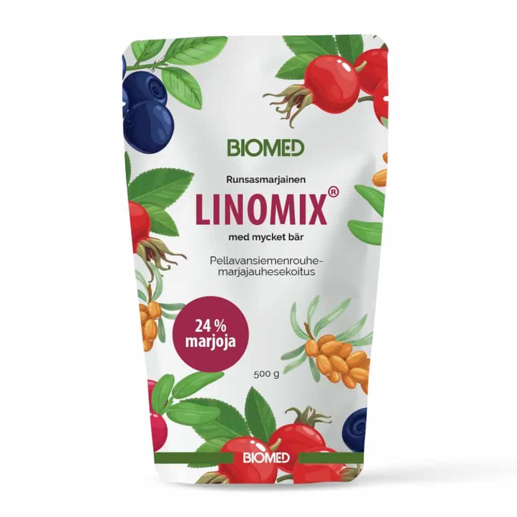 Pellavansiemenrouhe (muu kuin EU), ruusunmarjan kuorijauhe, kauralese, täysruokosokeri, karpalojauhe, mustikkajauhe, tyrnijauhe, hapettumisenestoaine (askorbiinihappo), paakkuuntumisenestoaine (piidioksidi).