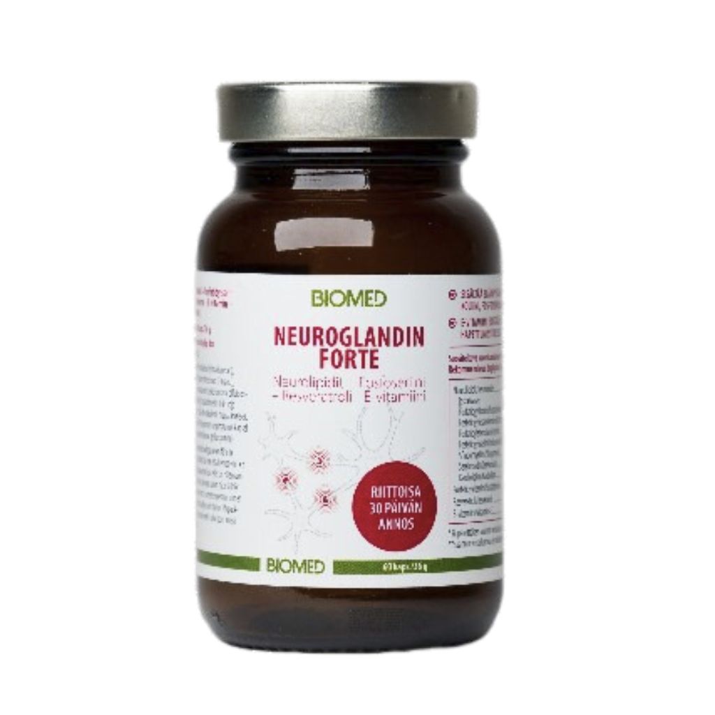 Neuroglandin sisältää eläinperäisiä fosfolipidejä ja pellavansiemenöljyä sekä fosfoseriinia, E-vitamiinia ja resveratrolia. -Neurolipidit -Fosfoseriini -Pellavansiemenöljy -E-vitamiini -Resveratroli Resveratroli: Resveratroli on useissa kasveissa esiintyvä fenoliyhdiste jota on löydetty erityisesti punaisista ja sinisistä rypäleistä sekä puolukoista, mustikoista ja karpaloista.