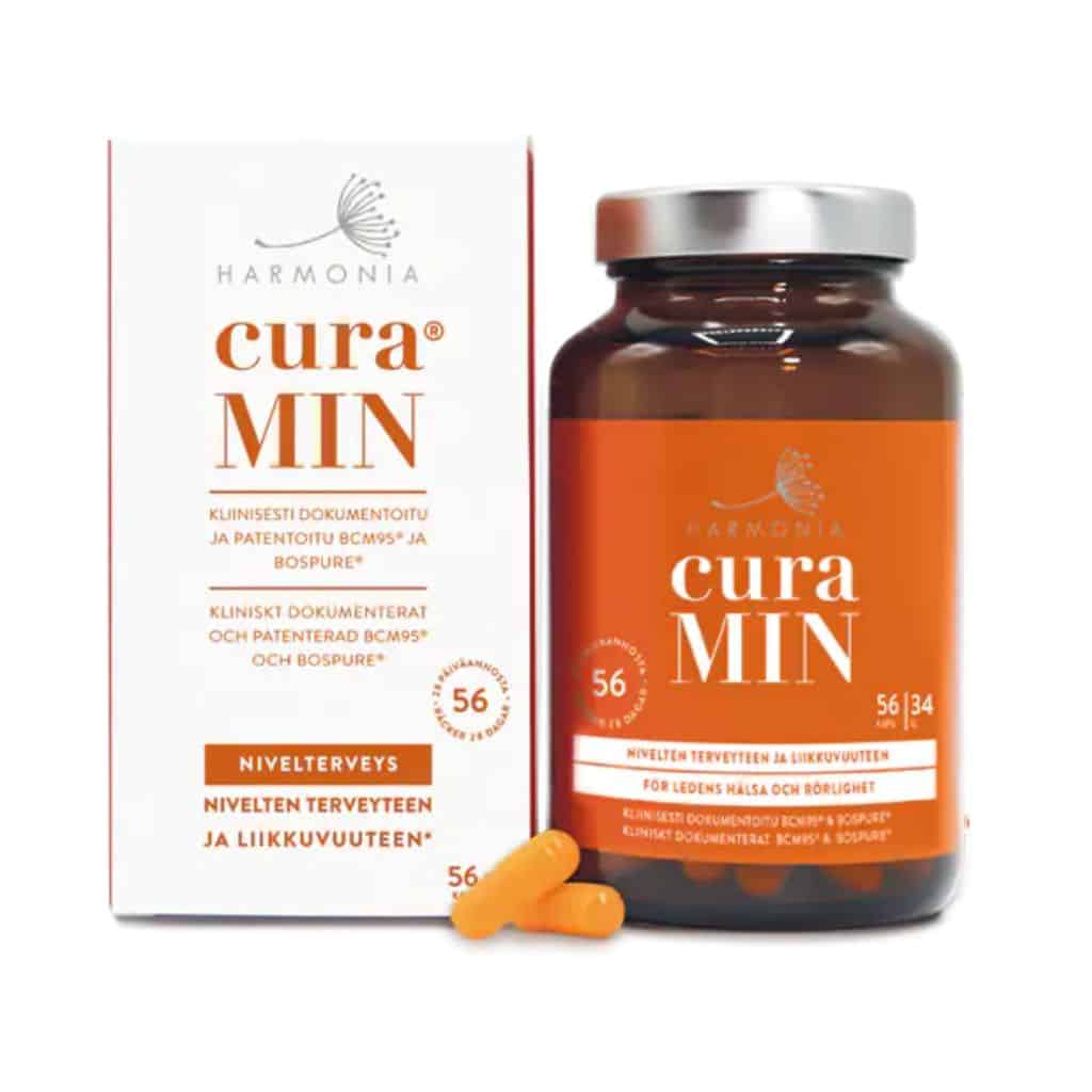 curaMIN® on huippuluokan nivelterveyttä ja immuunijärjestelmää tukeva ravintolisä, joka sisältää kahta hyvin dokumentoitua kasviuutetta: BCM95®-kurkumiinia ja BosPure®-boswelliaa. Näiden kasviuutteiden yhteisvaikutus tukee nivelten terveyttä ja liikkuvuutta, vähentää hapetusstressiä ja edistää immuunijärjestelmän normaalia toimintaa. Kurkuma auttaa suojaamaan soluja hapetusstressiltä ja tukemaan nivelten normaalia toimintaa, kun taas Boswellia edistää nivelten mukavuutta ja liikkuvuutta.