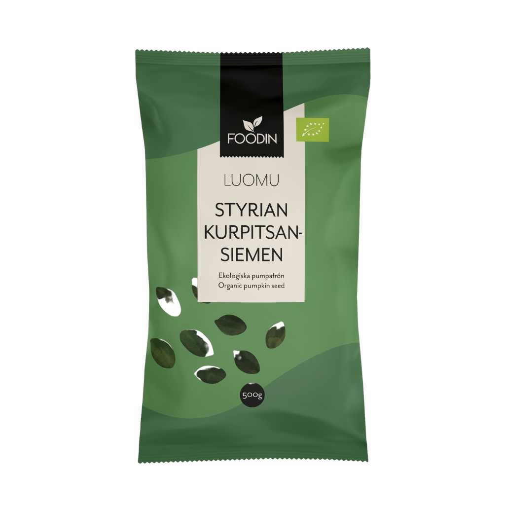 Arvostettu Styrian-lajikkeen kurpitsansiemen on tunnettu herkullisesta, voimakkaasta maustaan, suuresta koostaan ja tummasta väristään. Foodinin kurpitsansiemenet kasvatetaan Itävallassa uusiutuvaa vesienergiaa hyödyntäen, ja ne ovat hyvä rasvahappojen lähde osana monipuolista ja tasapainoista ruokavaliota.