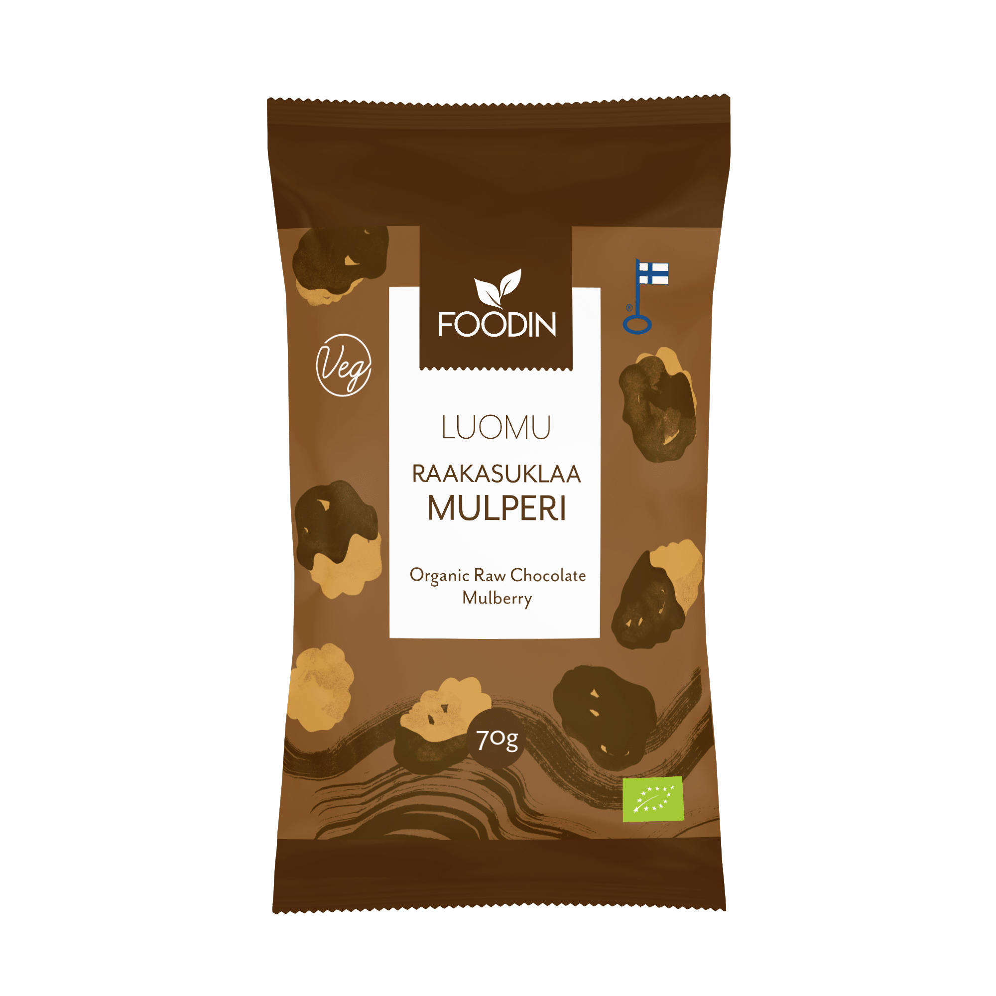 Foodin raakasuklaamulperi on yhdistelmä toffeemaisen makeaa, pehmeää mulperimarjaa ja tummaa, täyteläistä perulaista luomuraakasuklaata. Mulperimarjat ovat jo sellaisenaan kuin makeita, luonnon omia karkkeja, mutta yhidstettynä raakasuklaaseen ne saavat vielä kokonaan uuden ulottuvuuden! Nautiskele raakasuklaamulpereista sellaisenaan, tai lisää niitä mukaan leivonnaisiisi ja jälkiruokiisi. Raakasuklaamulperi sopii erinomaisesti myös välipalaksi – nappaa pussi mukaan lähtiessäsi metsään vaeltamaan tai kohti pitkäksi venyvää työpäivää.