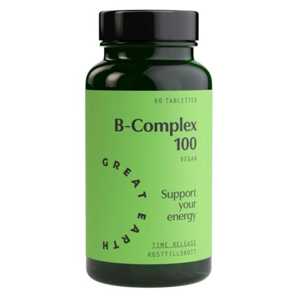 Great Earth B-Complex 100 hyödyntää Time Release -teknologiaa, jonka ansiosta B-vitamiinit vapautuvat asteittain 8 tunnin ajan ja imeytyvät elimistöön tehokkaasti. Tämä valmiste on erityisen hyvä aktiivista elämäntapaa eläville ja paljon stressaaville, sillä se tukee kehon energiantuotantoa ja palautumista.