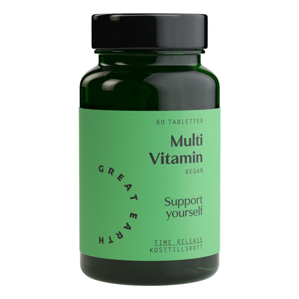 Great Earth Multi Vitamin on korkeasti annosteltu monivitamiini, joka on erityisesti suunniteltu sinulle, joka elät aktiivista ja kiireistä elämää. Se sisältää tärkeitä vitamiineja, joita kehosi tarvitsee voidakseen hyvin joka päivä. Time Release -järjestelmän ansiosta vitamiinit vapautuvat vähitellen useiden tuntien aikana, mikä takaa tasaisen ravintoaineiden saannin kehollesi.