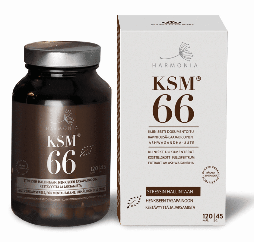 Ashwagandha (KSM66) on ravintolisä joka auttaa ylläpitämään stressinsietokykyä, fyysistä ja henkistä vireyttä. Se edistää toipumista stressaavista tilanteista ja emotionaalista tasapainoa ja unen tuloa. Tukee miehen seksuaalista halukkuutta ja toimintaa. Tukee naisen hedelmällisyyttä.