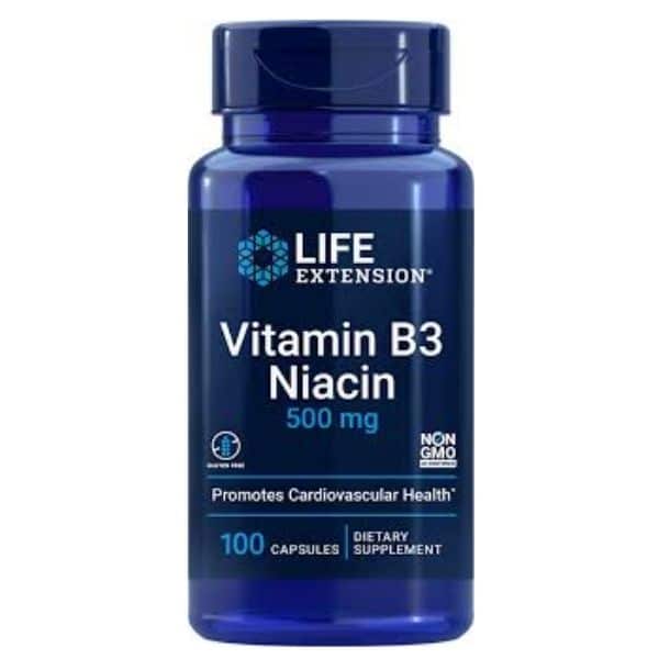 Life Extensionin niasiini on korkealaatuinen ravintolisä, joka sisältää 500 mg B3-vitamiinia kapselia kohti, tukien energiantuotantoa, aineenvaihduntaa sekä ihon, hermoston ja ruoansulatusjärjestelmän terveyttä.