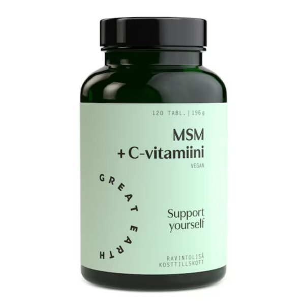 Great Earth MSM+C sisältää yhdistelmän MSM:ää ja C-vitamiinia. MSM (metyylisulfonyylimetaani) on orgaanista rikkiä, jota esiintyy luonnollisesti monissa ruoissa. Rikki on tärkeä kollageenin ja keratiinin rakennusaine, ja se vaikuttaa muun muassa rustojen, jänteiden, ihon, hiusten, kynsien, lihasten ja luuston hyvinvointiin. C-vitamiini edistää kollageenin normaalia muodostumista ja vähentää väsymystä ja uupumusta.