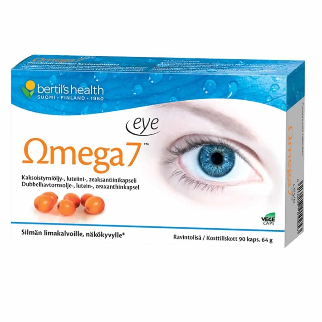 Omega7 Eye sisältää ns. kaksoistyrniöljyä (vakioitu SBA24-tyrniöljy), joka koostuu sekä tyrnin hedelmälihaöljystä että tyrnin siemenöljystä. Kokonaisuus vastaa siten koko tyrnimarjan alkuperäistä ja luonnostaan monipuolista öljyä. Kaksoistyrniöljy sisältää monipuolisesti hyviä rasvahappoja, kasvisteroleita ja antioksidantteja.