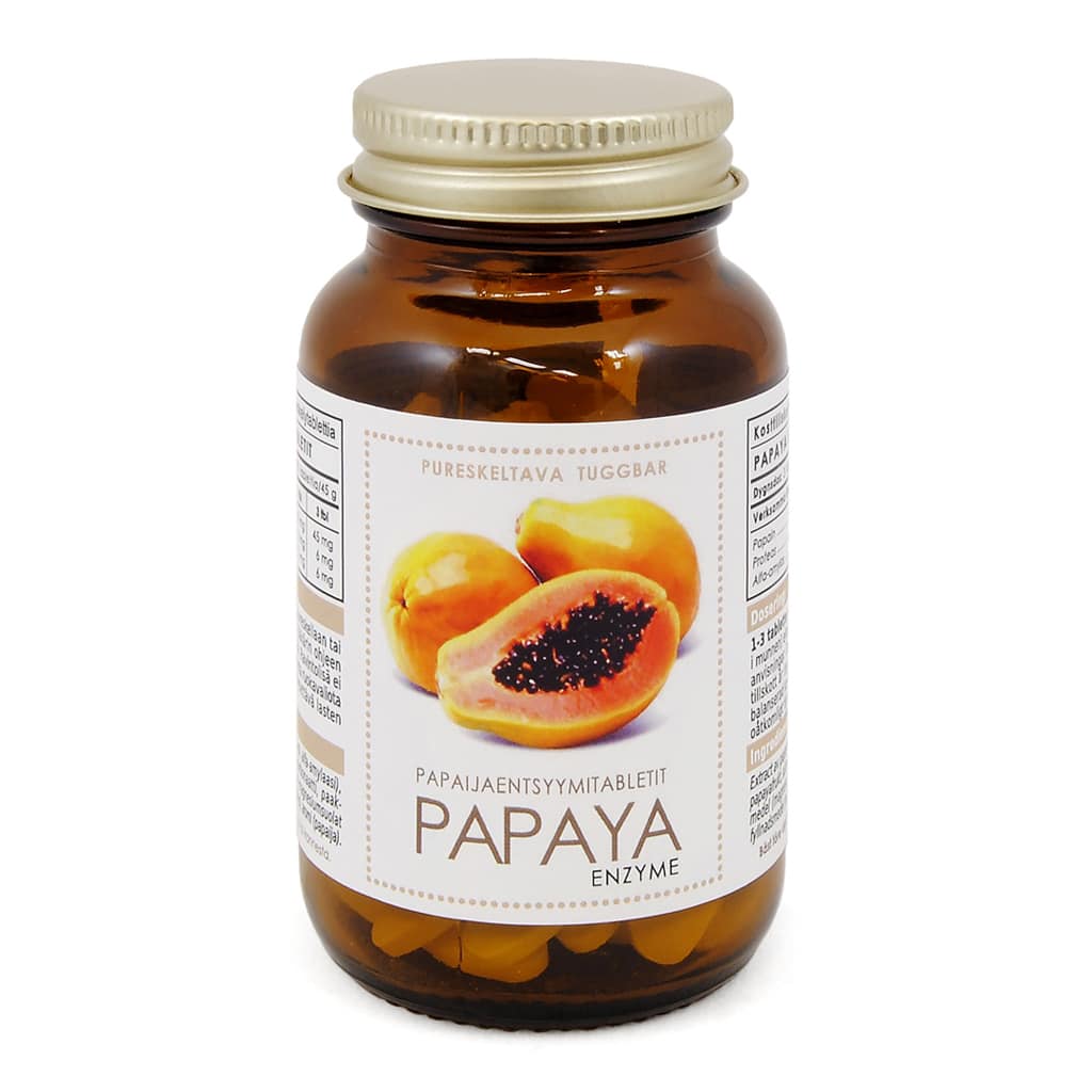 Vegetaarinen pureskeltava papaijaentsyymi ruoansulatuksen tueksi. Papaija on trooppinen hedelmä, joka sisältää ihmisen ruoansulatusta edistäviä proteolyyttisiä entsyymejä, kuten papaiinia.