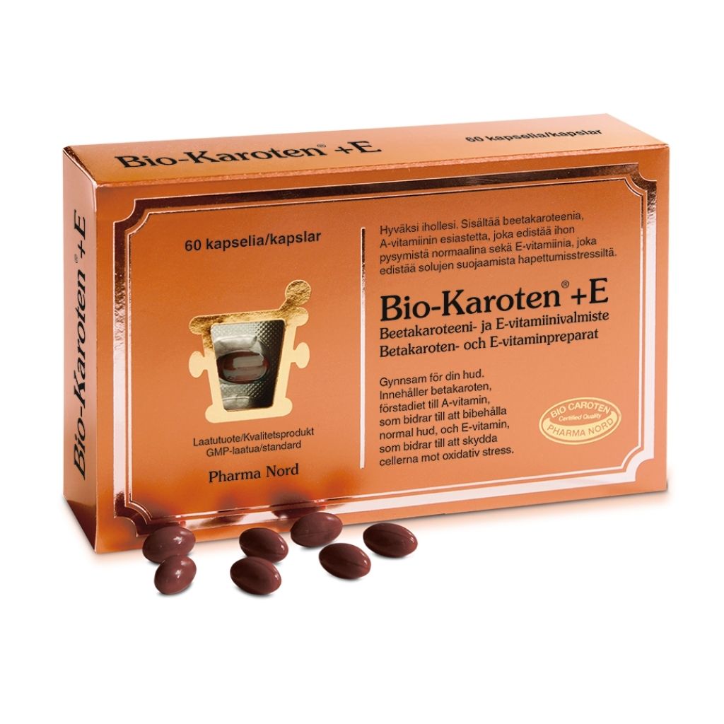 Beetakaroteeni – E-vitamiinivalmiste Hyväksi ihollesi. Sisältää beetakaroteenia, A-vitamiinin esiastetta, joka edistää ihon pysymistä normaalina, sekä E-vitamiinia, joka edistää solujen suojaamista hapettumisstressiltä. 1 kapseli sisältää: A-vitamiinia 1000 µg RE (A-vitamiinin lähteenä valmisteessa on: beetakaroteenia 6 mg)