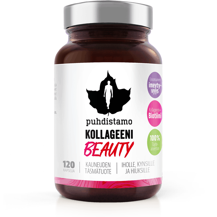 Puhdistamon Kollageeni Beauty-kapseli on maailman tutkituimman Verisol®-kollageenipeptidin, C-vitamiinin, Tripla SinkinTM sekä biotiinin täsmäyhdistelmä kauneudenhoitoon kätevässä kapselimuodossa. Kollageeni Beauty-kapseli tehostaa kehon omaa kollageenituotantoa ja vahvistaa ihon, kynsien ja hiuksien kuntoa.