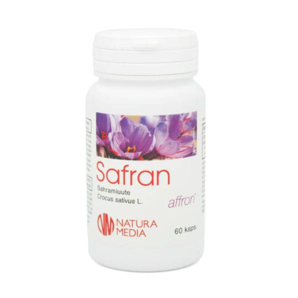 Natura Median Safran-kapselit sisältävät Affron®-sahramiuutetta, jonka positiiviset vaikutukset ovat tehneet siitä huippusuositun ympäri maailman! Uute saadaan Espanjassa viljeltyjen maustesahramin (Crocus sativus L.) kukkien luoteista. Laajalti dokumentoidussa Affron®-uutteessa on standardoitu pitoisuus, 3,5 % Lepticrosalides®-nimistä bioaktiivisten yhdisteiden kokonaisuutta, jotka ovat keskenään synergisiä ja joihin uutteen teho perustuu. Yhdessä kapselissa on 30 mg Affron®-uutetta, eli vain yksi kapseli päivässä riittää.