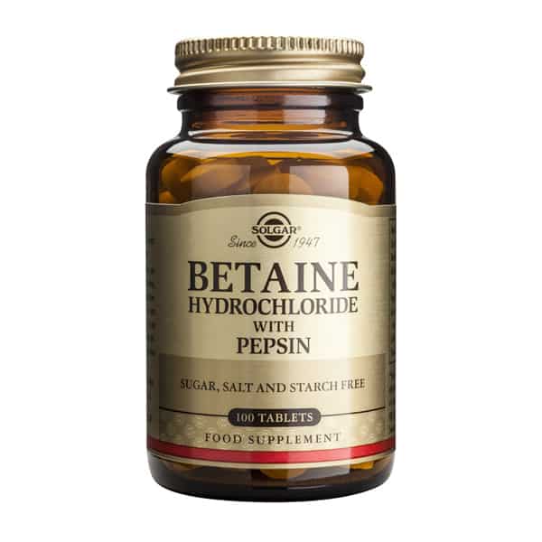 Betaiini Hydrokloridi ja pepsiini ravintolisä aikuisille ruoansulatuksen tueksi. Närästys saattaa johtua suolahapon puutteesta. Suolahappo auttaa kalsiumia imeytymään.