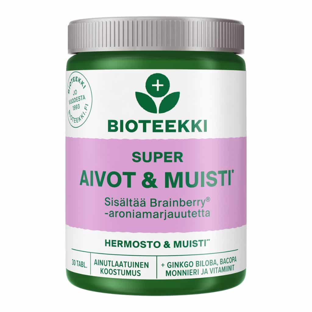 Bioteekin Super Aivot & Muisti -valmiste sisältää patentoitua, kliinisesti tutkittua Brainberry®-aroniamarjauutetta sekä aivojen ja muistin toimintaa tukevaa Bakopauutetta. Neidonhiuspuu-uute (Ginkgo Biloba) tukee kognitiivisia toimintoja, kun taas B6-, B12- ja C-vitamiini tukevat psykologisia toimintoja ja hermoston normaalia toimintaa.