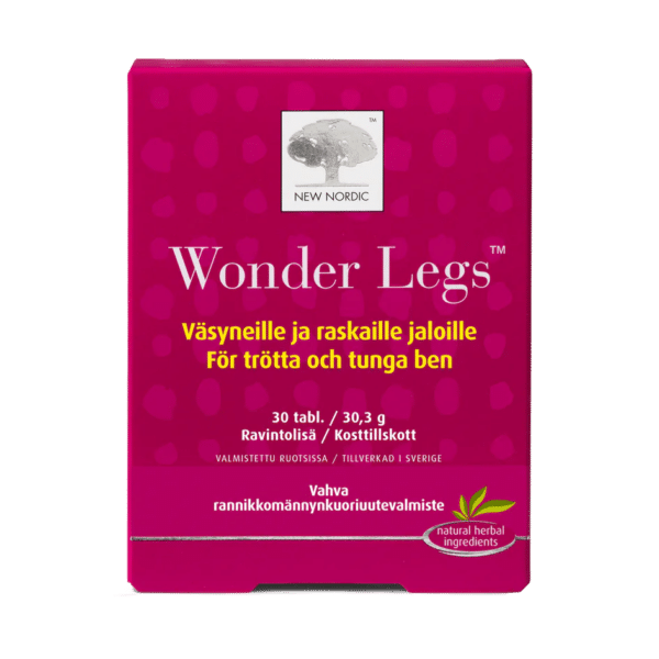 VÄSYNEILLE JA RASKAILLE JALOILLE Wonder Legs™tabletit sisältävät luontaisia proantosyaniideja (OPG), jotka voivat helpottaa raskailta tuntuvia ja väsyneitä jalkoja ylläpitämällä jalkojen hyvää verenkiertoa. Ainutlaatuinen bioaktiivinen yhdistelmä auttaa vähentämään jalkojen väsymystä ja turvotusta pitkäaikaisen istumisen tai seisomisen jälkeen. Wonder Legs tabletit sisältävät rannikkomännyn kuoriuutetta ja punaisen viinirypäleen lehtiuutetta.